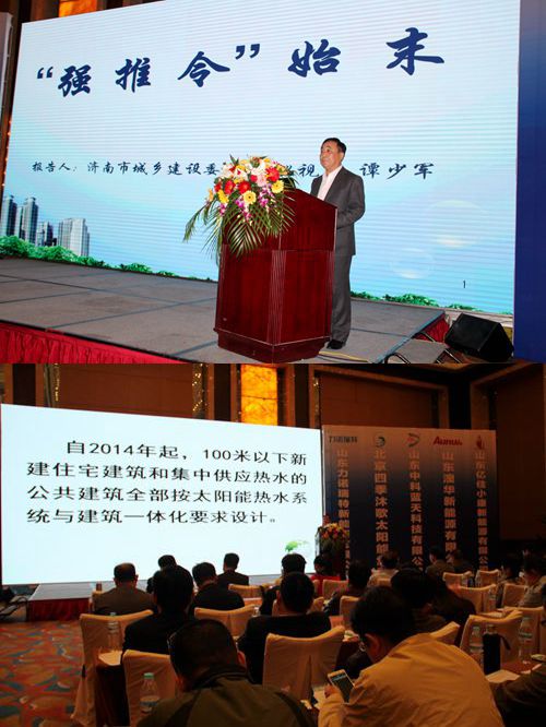 大會(huì)由桑樂(lè)集團(tuán)第一工程公司經(jīng)理王海燕主持。會(huì)議從濟(jì)南市城鄉(xiāng)建設(shè)委“強(qiáng)推令”始末講起,自2014年1月1日起,濟(jì)南市決定100米以下新建高層住宅和集中使用熱水的公共建筑強(qiáng)制推廣使用太陽(yáng)能熱水系統(tǒng),同時(shí)推出實(shí)施細(xì)則和相應(yīng)的圖則。2014年4月1日《杭州市民用建筑節(jié)能條例》也規(guī)定:十二層以下新建居住建筑,超過(guò)十二層新建居住建筑的逆六層,應(yīng)當(dāng)設(shè)計(jì)太陽(yáng)能熱水系統(tǒng)與建筑一體化。太陽(yáng)能強(qiáng)推政策,節(jié)能減排,勢(shì)在必行。