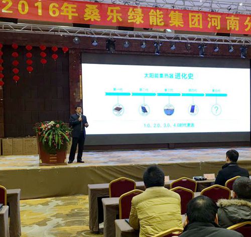 河南公司副總經理陳宇對公司2016年新品與會展示。桑樂堅持技術創(chuàng)新,從用戶體驗入手的設計思路將桑樂綠能新品進行了新的詮釋,并結合市場機遇提出了市場發(fā)展的新思路。