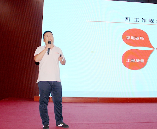 遲總用四個“心”展開了他的報告。他講到要用恒心做市場,用心做工程,以實現(xiàn)工程市場多點開花,工程無大小,全力爭奪。目前浙江市場是桑樂最大的空氣能市場,在工作中常與核心經(jīng)銷商溝通交流,多解決問題,通過多調(diào)研,多總結(jié),強(qiáng)推廣,多角度支持鄉(xiāng)鎮(zhèn)零售工作。