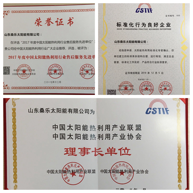 2017年太陽(yáng)能熱利用行業(yè)年會(huì)上,桑樂(lè)再次當(dāng)選行業(yè)理事長(zhǎng)單位,一舉斬獲2017年度中國(guó)太陽(yáng)能熱利用行業(yè)“標(biāo)準(zhǔn)化良好行為企業(yè)”、“售后服務(wù)先進(jìn)單位”兩項(xiàng)殊榮。