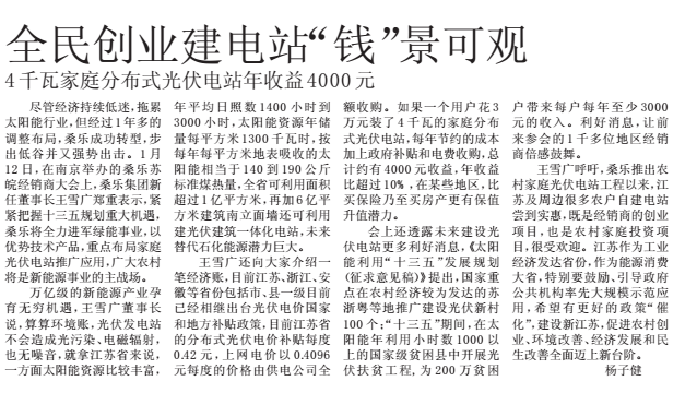 王雪廣還向大家介紹一筆經(jīng)濟賬,目前江蘇、浙江、安徽等省份包括市、縣一級目前已經(jīng)相繼出臺光伏電價國家和地方補貼政策,目前江蘇省的分布式光伏電價補貼每度0.42元,上網(wǎng)電價以0.4096元每度的價格由供電公司全額收購。如果一個用戶花3萬元裝了4千瓦的家庭分布式光伏電站,每年節(jié)約的成本加上政府補貼和電費收購,總計約有4000元收益,年收益比超過10%,在某些地區(qū),比買保險乃至買房產(chǎn)更有保值升值潛力。