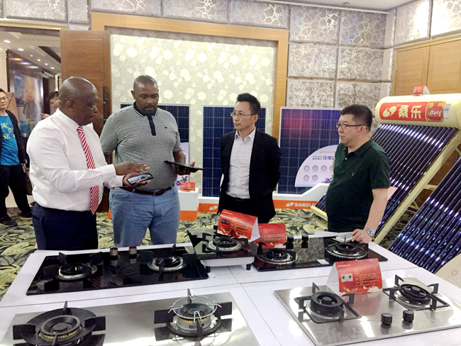 參觀完畢后,南非客戶又來(lái)到河北訂貨會(huì)現(xiàn)場(chǎng),高朋滿座令南非客戶激動(dòng)不已。集團(tuán)副總馮磊向南非客戶介紹了公司近期的發(fā)展情況以及未來(lái)的戰(zhàn)略構(gòu)想,并帶領(lǐng)外商參觀了河北會(huì)議的桑樂(lè)展館,光熱、光伏、多元化廚電等產(chǎn)品琳瑯滿目,桑樂(lè)展品吸引了外商頻頻拍照,南非客戶表示將繼續(xù)加強(qiáng)與桑樂(lè)的合作。