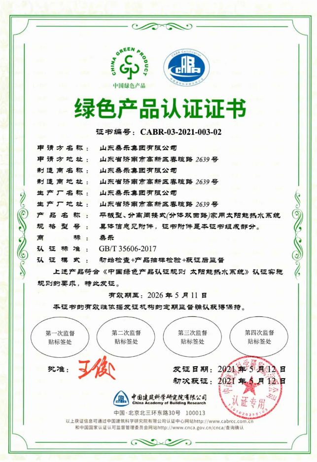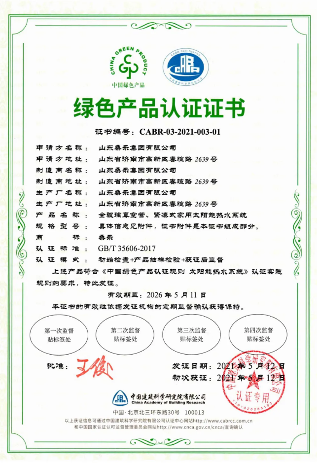 512日,通過(guò)中國(guó)建筑科學(xué)研究院有限公司認(rèn)證,桑樂(lè)集團(tuán)榮獲太陽(yáng)能熱水系統(tǒng)中國(guó)綠色產(chǎn)品認(rèn)證證書(shū),這也是中國(guó)建研院頒發(fā)的首個(gè)太陽(yáng)能領(lǐng)域綠色產(chǎn)品認(rèn)證證書(shū)。