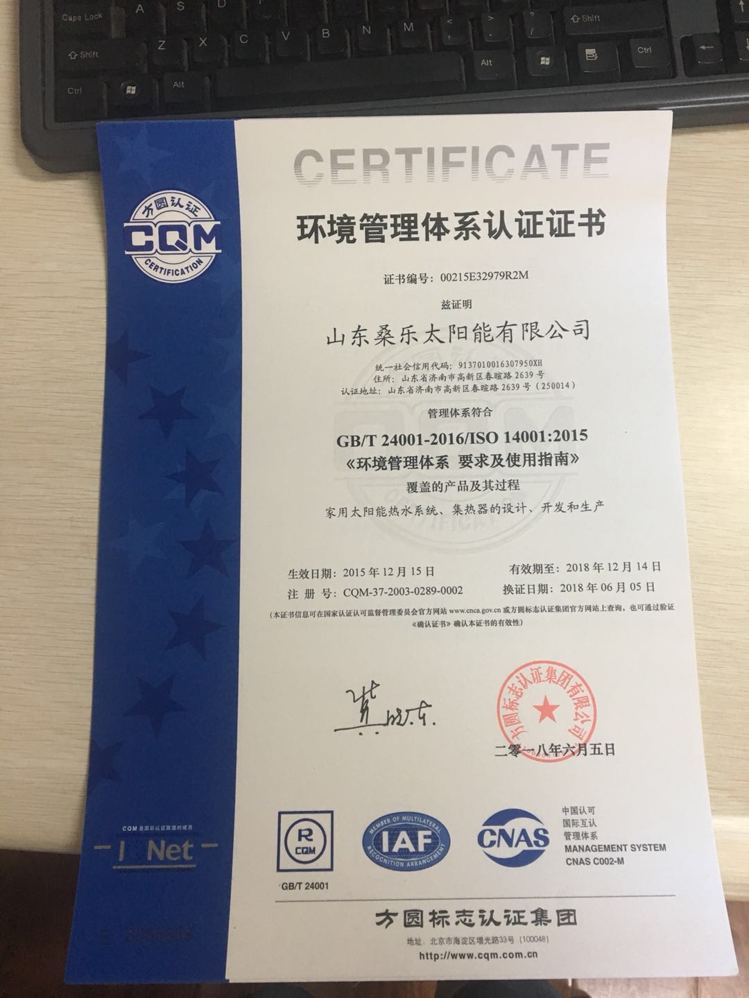 環(huán)境管理體系認(rèn)證證書